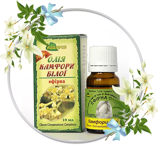 Камфорну олію отримують з високого вічнозеленого лаврового дерева. Камфора має заспокійливу і пом’якшувальну дію при депресіях, розумовій млявості, безсонню і шоці. Є сечогінним засобом. Наявність антисептичних властивостей дозволяє широко використовувати її при захворюваннях верхніх дихальних шляхів, особливо методом інгаляції завдяки високій летючості камфори, а також при інфекційних захворюваннях шкіри. Зміцнює імунну систему.