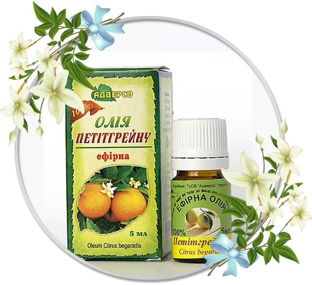 Ефірна олія петітгрейну розгладжує зморшки, повертає пружність виснаженій шкірі обличчя, перешкоджає утворенню розтяжок при різких змінах об’ємів тіла. Попереджає випадання волосся і облисіння. Усуває набряки втомлених ніг, знімає сильний запах поту. Застосовується для ароматизації приміщень, збагачення кремів, тоніків, полоскання порожнини рота, прохолодних ванн для ніг.