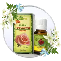 Ефірна олія троянди - королівська олія. Усуває неврози, спазми головного мозку (нудота, слабкість, мігрень, головний біль). Підвищує працездатність. Нормалізує роботу ендокринних залоз, відновлює гормональне здоров’я, омолоджує та регенерує клітини; нормалізує роботу ШКТ, менструальний цикл, усуває вагініти та молочницю. Має радіопротекторну та антиканцерогенну дію.