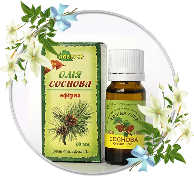 Ефірна олія соснова сильний антисептичний засіб для дихальних, жовчовивідних та сечовивідних шляхів. Стимулює кору наднирників. Ефективна при легеневих, ревматичних захворюваннях та грипі. Антисептик бальзамуючий.