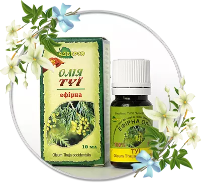 Ефірна олія туї усуває порушення в сечостатевій сфері. Має відхаркувальну, потогінну і сечогінну дію. Використовується для лікування бронхітів, запалення легень, гаймориту, тонзиліту, аденоїдів, стоматитів, пародонтозі, карієсі. Застосовується проти кишкових паразитів. Підходить для догляду за жирною шкірою, зміцнює волосся, рекомендується для догляду за жирним волоссям.