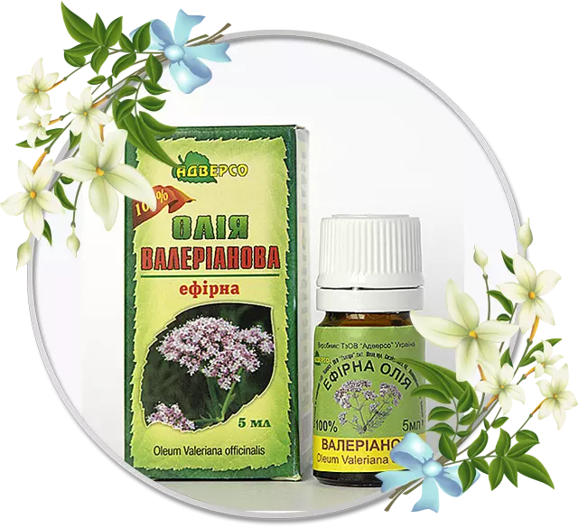 Ефірна олія валеріанова має властивість заспокоювати, знижувати збудливість і усувати почуття тривоги і страху. Добре допомагає боротися з безсонням та істерією. Олія валер’яни ефективно застосовується для зменшення гіперчутливості шкіри, при нейродермітах, стресових висипаннях на шкірі. Вона усуває головні болі нервового походження, спазми коронарних судин, нервові болі в серці.