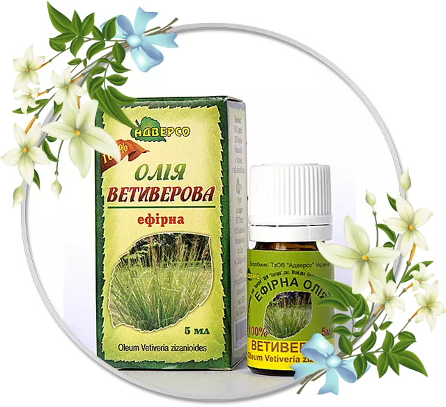 Ефірна олія ветиверії чудово допомагає людям, що страждають такими недугами, як артрит і ревматизм, також вона знімає м’язові напруження і болі. Маючи сильну антисептичну дію, ветиверова олія ефективна при захворюваннях верхніх дихальних шляхів, бронхітах і ларингіті. Ефірна олія ветиверії є однією з улюблених олій косметологів, так як омолоджує шкіру, очищає її від відмерлих клітин, надає шкірі еластичність. Ветиверова олія, володіючи потогінною і сечогінною дією, є прекрасним протинабряковим засобом і допомагає позбавитися від целюліту.